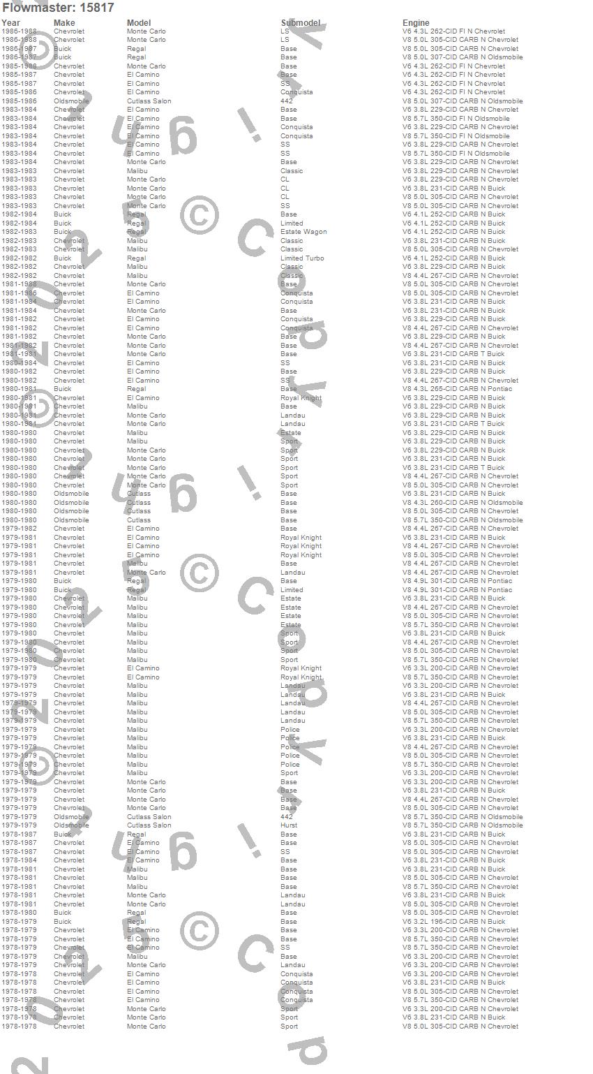 Below is an abreviated list of applications for the Tailpipe Set.