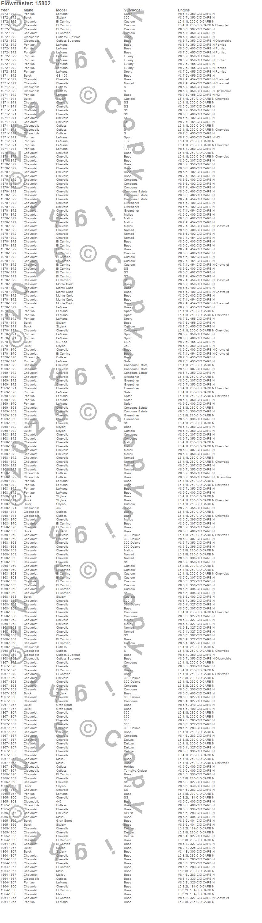 Below is an abreviated list of applications for the Tailpipe Set.