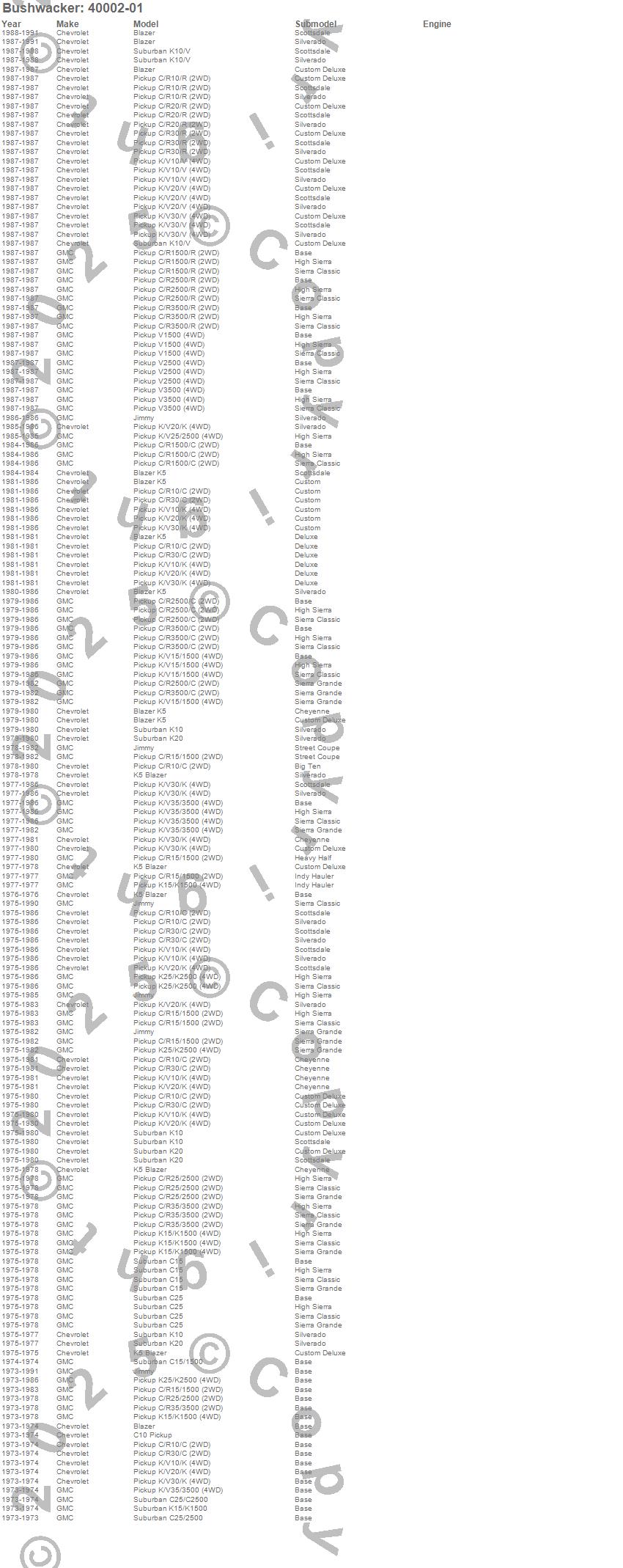 Blazer, Blazer K5, C10 Pickup, C10 Suburban, C15 Suburban, C15/C1500, C15/C1500 Suburban, C1500, C1500 Suburban, C20 Pickup, C20 Suburban, C25 Suburban, C25/C2500 Pickup, C25/C2500 Suburban, C2500 Pickup, C2500 Suburban, C30 Pickup, C35/C3500 Pickup, C3500 Pickup, Jimmy more…