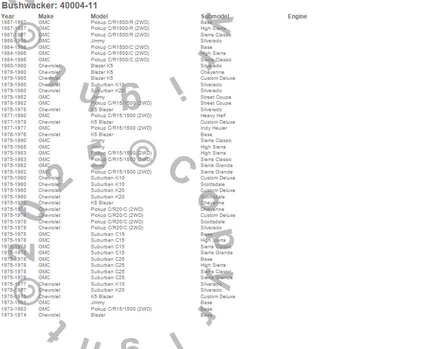 Blazer, Blazer K5, C10 Pickup, C10 Suburban, C15 Suburban, C15/C1500, C15/C1500 Suburban, C1500, C1500 Suburban, C20 Pickup, C20 Suburban, C25 Suburban, C25/C2500 Pickup, C25/C2500 Suburban, C2500 Pickup, C2500 Suburban, C30 Pickup, C35/C3500 Pickup, C3500 Pickup, Jimmy more…