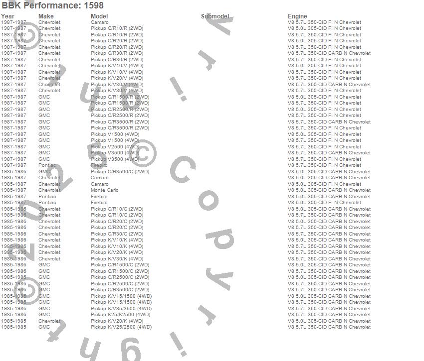 C10 Pickup, C1500, C20 Pickup, C2500 Pickup, C30 Pickup, C3500 Pickup, Camaro, Firebird, K10 Pickup, K1500, K20 Pickup, K2500 Pickup, K30 Pickup, K3500 Pickup, Monte Carlo, R10 Pickup, R1500 Pickup, R20 Pickup, R2500 Pickup, R30 Pickup more…