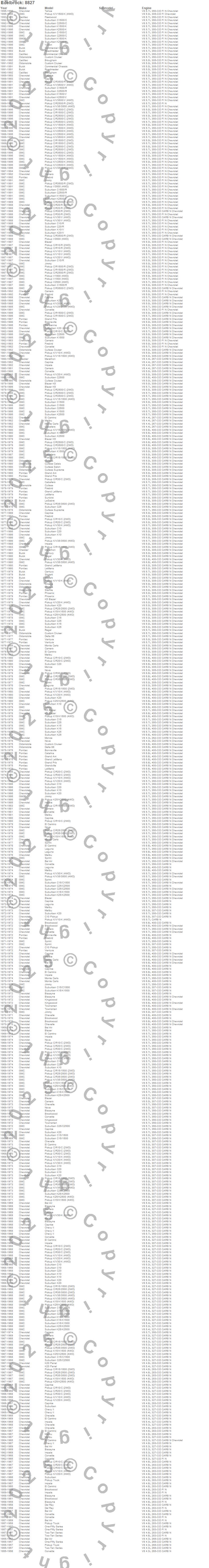 98, Apollo, Bel Air, Biscayne, Blazer, Blazer K5, Bonneville, Brookwood, Brougham, C10 Pickup, C10 Suburban, C15 Suburban, C15/C1500, C15/C1500 Suburban, C1500, C1500 Pickup, C1500 Suburban, C20 Pickup, C20 Suburban, C25 Suburban more…