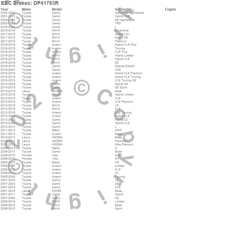 Below is an abreviated list of applications for the Yellowstuff Street And Track Brake Pads. Avalon, Camry, ES300h, ES350, HS250h, Matrix, RAV4, Vibe, Lexus, Pontiac, Toyota, 2016, 2015, 2014, 2013, 2012, 2011, 2010, 2009, 2008 more…