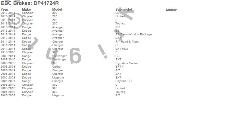 Below is an abreviated list of applications for the Yellowstuff Street And Track Brake Pads. 200, 300, Avenger, Caliber, Challenger, Charger, Magnum, Chrysler, Dodge, 2014, 2013, 2011, 2010, 2009, 2008, 2007, 2006, 2005 more…