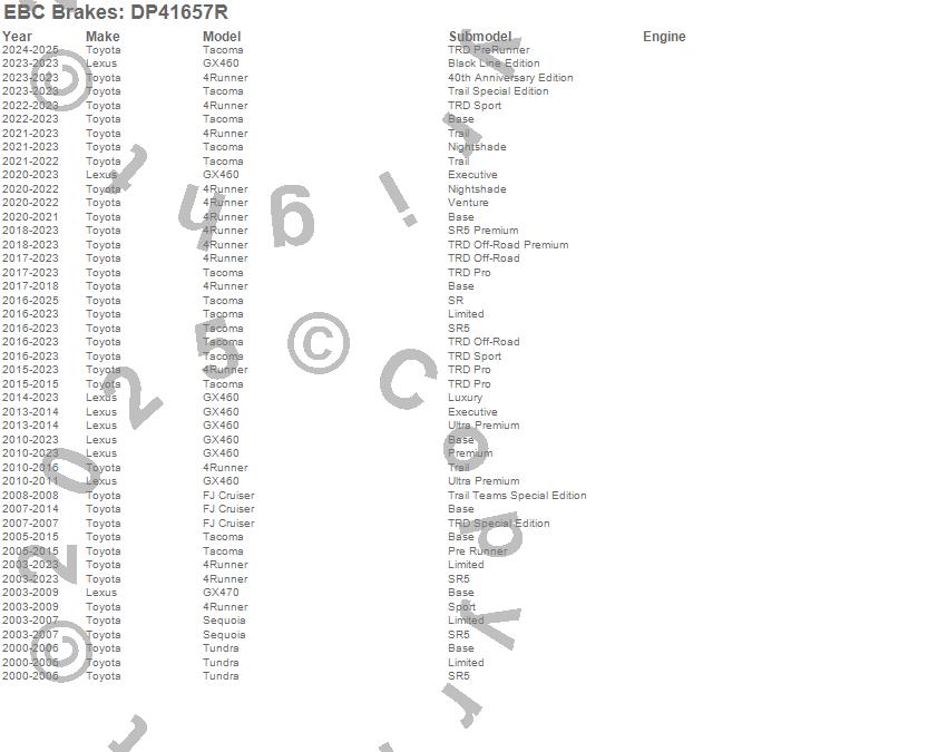 Below is an abreviated list of applications for the Yellowstuff Street And Track Brake Pads. 4Runner, FJ Cruiser, GX460, GX470, Sequoia, Tacoma, Tundra, Lexus, Toyota, 2016, 2015, 2014, 2013, 2012, 2011, 2010, 2009, 2008, 2007, 2006 more…