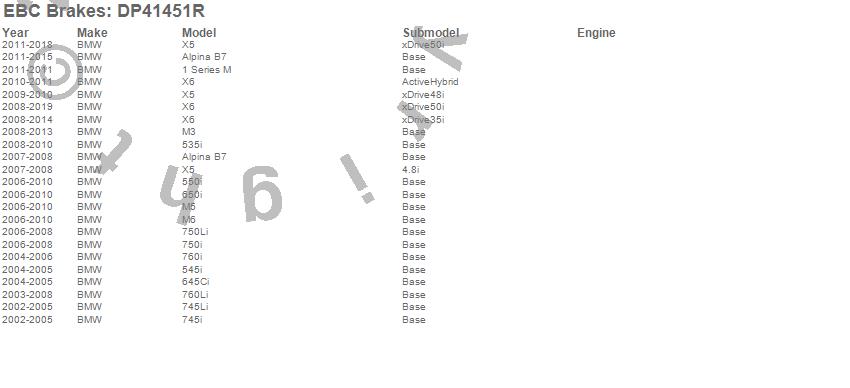 Below is an abreviated list of applications for the Yellowstuff Street And Track Brake Pads. 1 Series M, 535i, 545i, 550i, 645Ci, 650i, 745i, 745Li, 750i, 750Li, 760i, 760Li, Alpina B7, Alpina B7L, M3, M5, M6, X5, X6, BMW more…