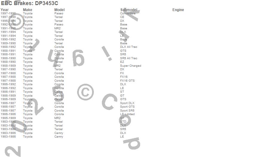 Below is an abreviated list of applications for the EBC Redstuff Ceramic Low Dust Brake Pads. Camry, Celica, Corolla, MR2, Paseo, Tercel, Toyota, 1998, 1997, 1996, 1995, 1994, 1993, 1992, 1991, 1990, 1989, 1988, 1987, 1986 more…