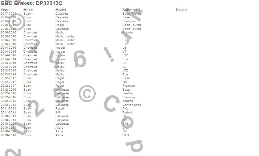 Below is an abreviated list of applications for the EBC Redstuff Ceramic Low Dust Brake Pads.