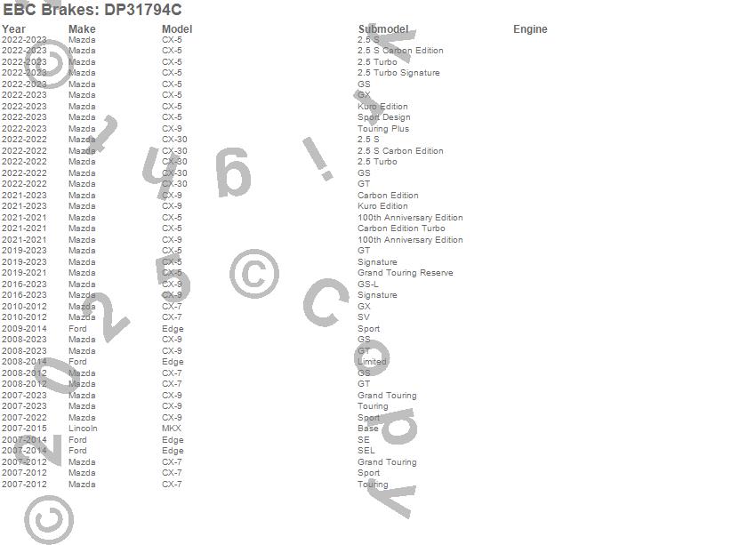 Below is an abreviated list of applications for the EBC Redstuff Ceramic Low Dust Brake Pads.