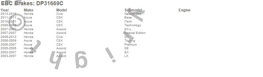 Below is an abreviated list of applications for the EBC Redstuff Ceramic Low Dust Brake Pads. Accord, Civic, CSX, Acura, Honda, 2015, 2014, 2013, 2012, 2011, 2010, 2009, 2008, 2007, 2006, 2005, 2004, 2003 more…
