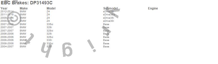 Below is an abreviated list of applications for the EBC Redstuff Ceramic Low Dust Brake Pads. 325i, 325xi, 328i, 328xi, 330i, 330xi, 335xi, 525i, Z4, BMW, 2014, 2013, 2012, 2011, 2010, 2009, 2008, 2007, 2006, 2005 more...