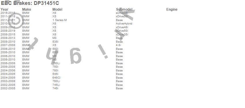 Below is an abreviated list of applications for the EBC Redstuff Ceramic Low Dust Brake Pads. 1 Series M, 535i, 545i, 550i, 645Ci, 650i, 745i, 745Li, 750i, 750Li, 760i, 760Li, M3, M5, M6, X5, X6, BMW, 2015, 2014 more...