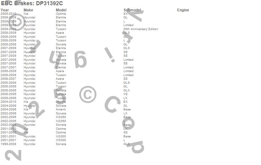 Below is an abreviated list of applications for the EBC Redstuff Ceramic Low Dust Brake Pads. Amanti, Azera, Elantra, Optima, Sonata, Tucson, XG300, XG350, Hyundai, Kia, 2010, 2009, 2008, 2007, 2006, 2005, 2004, 2003, 2002, 2001 more...