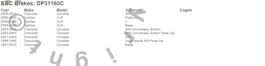 Below is an abreviated list of applications for the EBC Redstuff Ceramic Low Dust Brake Pads. Corvette, XLR, Cadillac, Chevrolet, 2013, 2012, 2011, 2010, 2009, 2008, 2007, 2006, 2005, 2004, 2003, 2002, 2001, 2000, 1999, 1998 more...