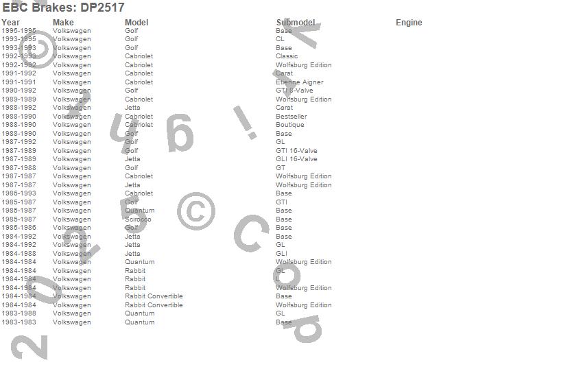 Below is an abreviated list of applications for the EBC Greenstuff 2000 Series Sport Brake Pads.