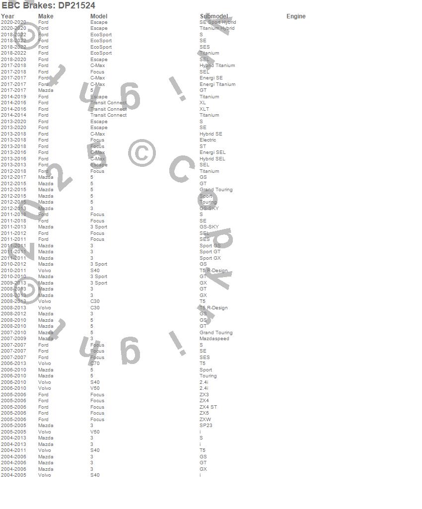 Below is an abreviated list of applications for the EBC Greenstuff 2000 Series Sport Brake Pads.