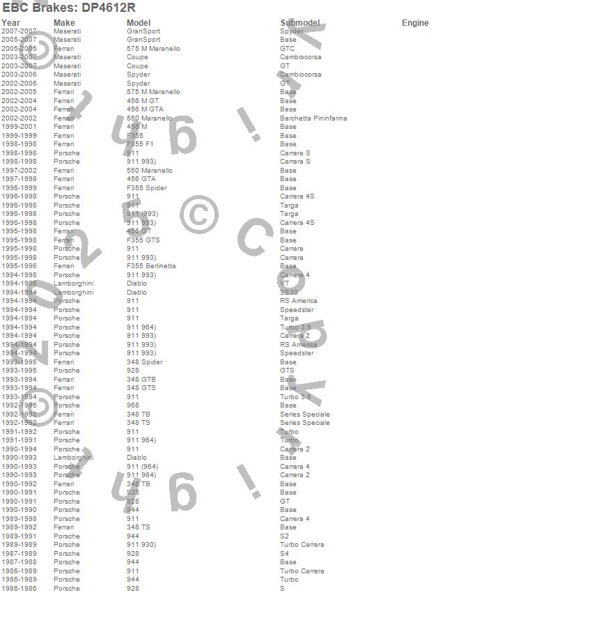 348 GTB, 348 GTS, 348 Spider, 348 TB, 348 TS, 456 GT, 456 GTA, 456 M, 456 M GT, 456 M GTA, 550 Barchetta, 550 Maranello, 575 M Maranello, 911, 928, 944, 968, Coupe, Diablo, F355 more…