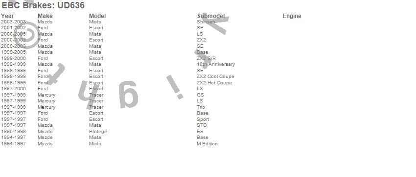 Below is an abreviated list of applications for the EBC Ultimax OEM Replacement Brake Pads. Escort, Miata, Protege, Tracer, Ford, Mazda, Mercury, 2005, 2004, 2003, 2002, 2001, 2000, 1999, 1998, 1997, 1996, 1995, 1994 more…