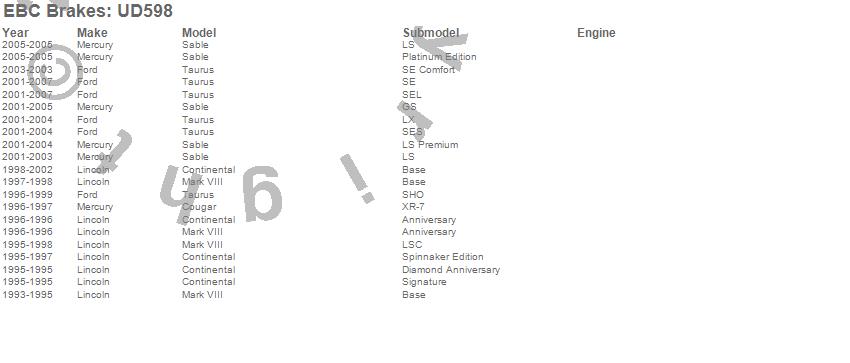Below is an abreviated list of applications for the EBC Ultimax OEM Replacement Brake Pads. Continental, Cougar, Mark VIII, Sable, Taurus, Ford, Lincoln, Mercury, 2007, 2006, 2005, 2004, 2003, 2002, 2001, 2000, 1999, 1998, 1997, 1996 more…
