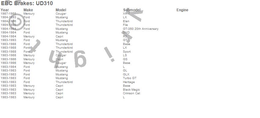 Below is an abreviated list of applications for the EBC Ultimax OEM Replacement Brake Pads. Capri, Cougar, Mustang, Thunderbird, Ford, Mercury, 1993, 1992, 1991, 1990, 1989, 1988, 1987, 1986, 1985, 1984, 1983 more…