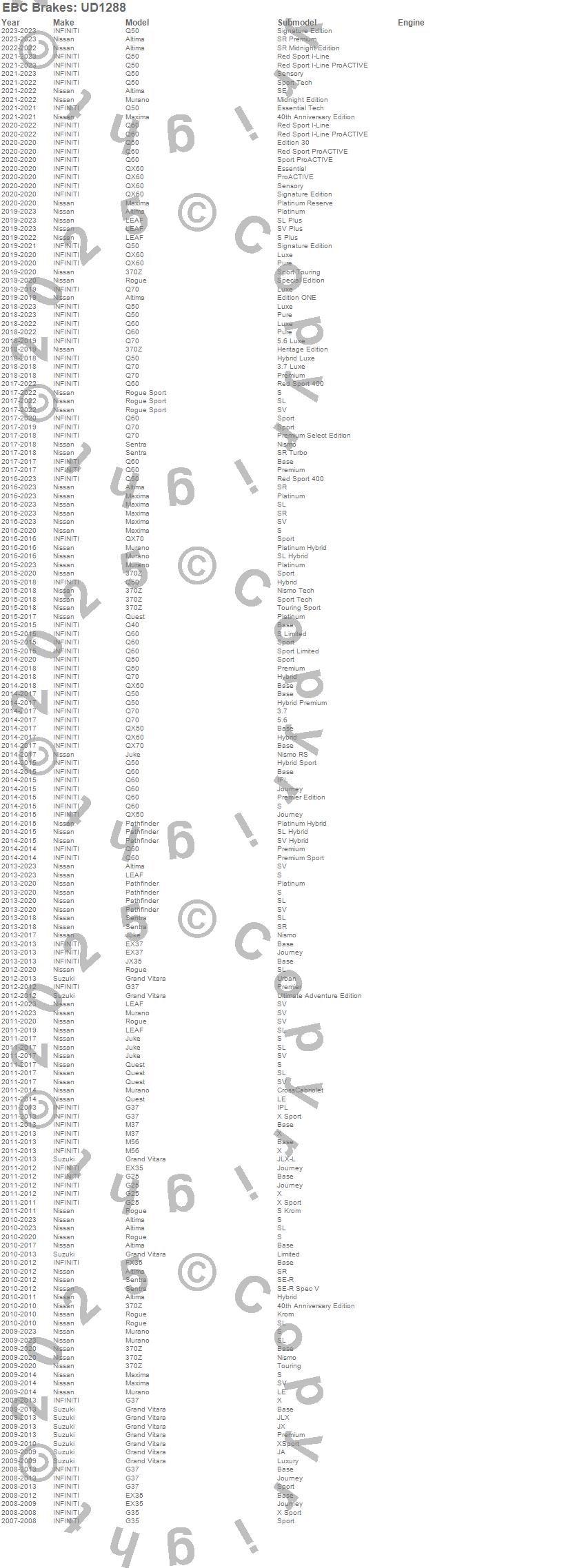 Below is an abreviated list of applications for the EBC Ultimax OEM Replacement Brake Pads. 370Z, Altima, EX35, EX37, FX35, G25, G35, G37, Grand Vitara, Juke, JX35, Leaf, M37, M56, Maxima, Murano, Pathfinder, Q50, Q60, Q70 more…