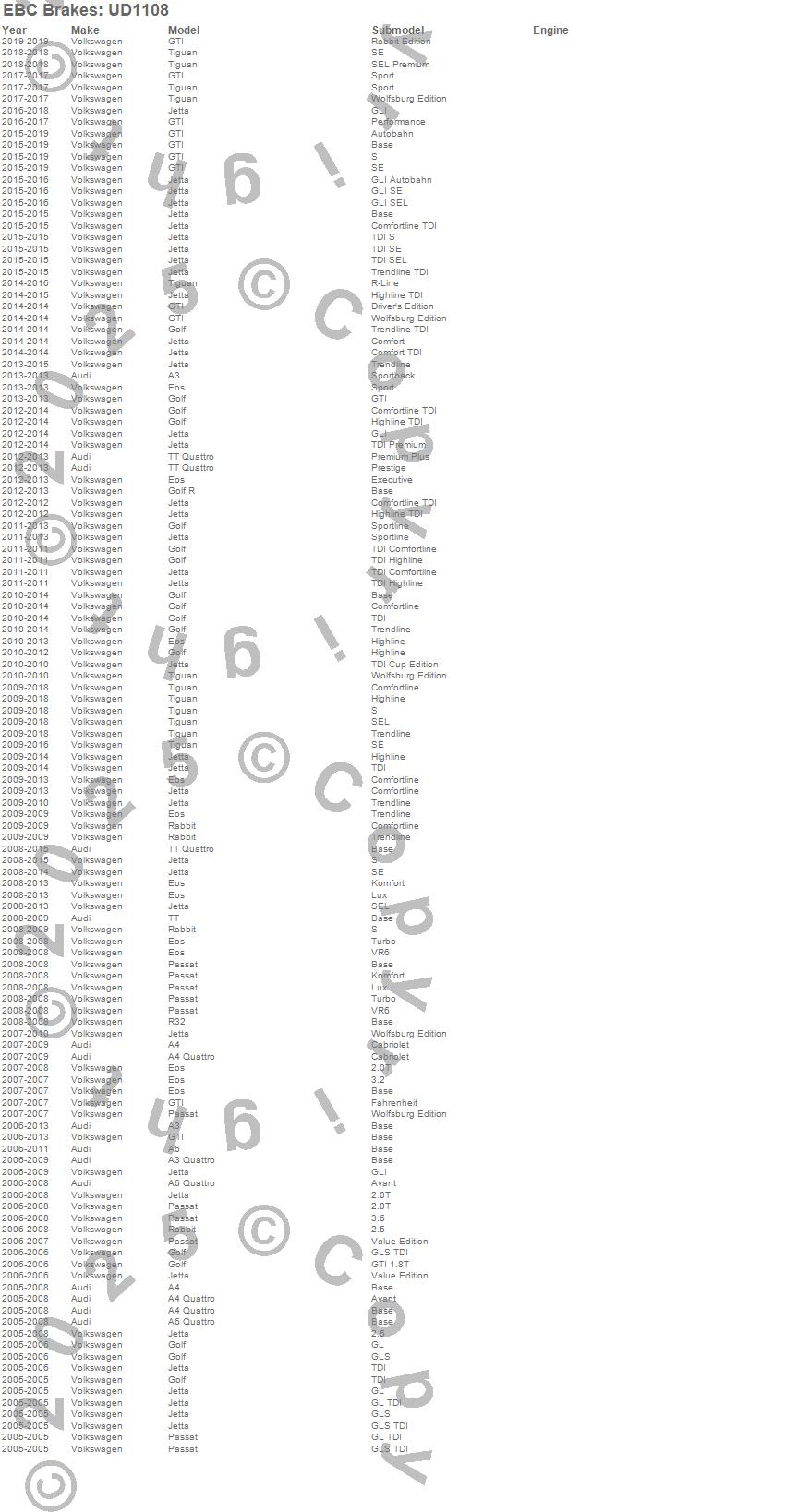 Below is an abreviated list of applications for the EBC Ultimax OEM Replacement Brake Pads. A3, A3 Quattro, A4, A4 Quattro, A6, A6 Quattro, Eos, Golf, GTI, Jetta, Passat, R32, Rabbit, Tiguan, TT, TT Quattro, Audi, Volkswagen, 2016, 2015 more…