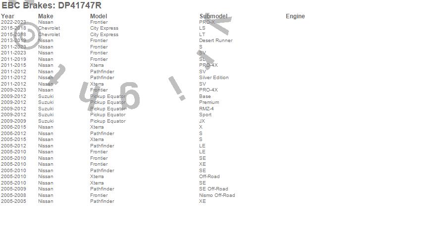 Below is an abreviated list of applications for the Yellowstuff Street And Track Brake Pads. Equator, Frontier, Pathfinder, Xterra, Nissan, Suzuki, 2016, 2015, 2014, 2013, 2012, 2011, 2010, 2009, 2008, 2007, 2006, 2005 more…