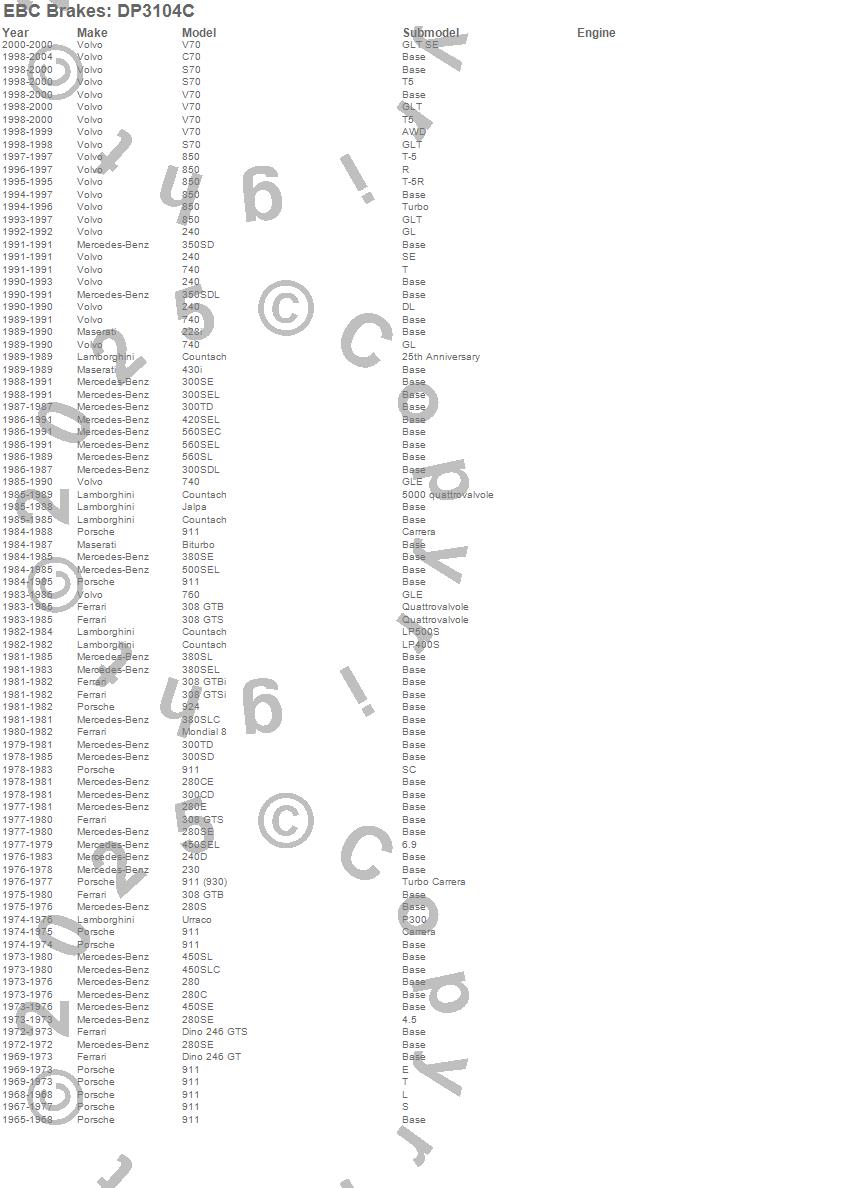 Below is an abreviated list of applications for the EBC Redstuff Ceramic Low Dust Brake Pads. 228i, 230, 240, 240D, 280, 280C, 280CE, 280E, 280S, 280SE, 300CD, 300D, 300SD, 300SDL, 300SE, 300SEL, 300TD, 308 GTB, 308 GTBi, 308 GTS more...