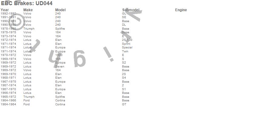 Below is an abreviated list of applications for the EBC Ultimax OEM Replacement Brake Pads. 164, 1800, 240, Elan, Europa, Seven, Spitfire, Lotus, Triumph, Volvo, 1993, 1992, 1991, 1990, 1980, 1979, 1978, 1977, 1976, 1975 more…