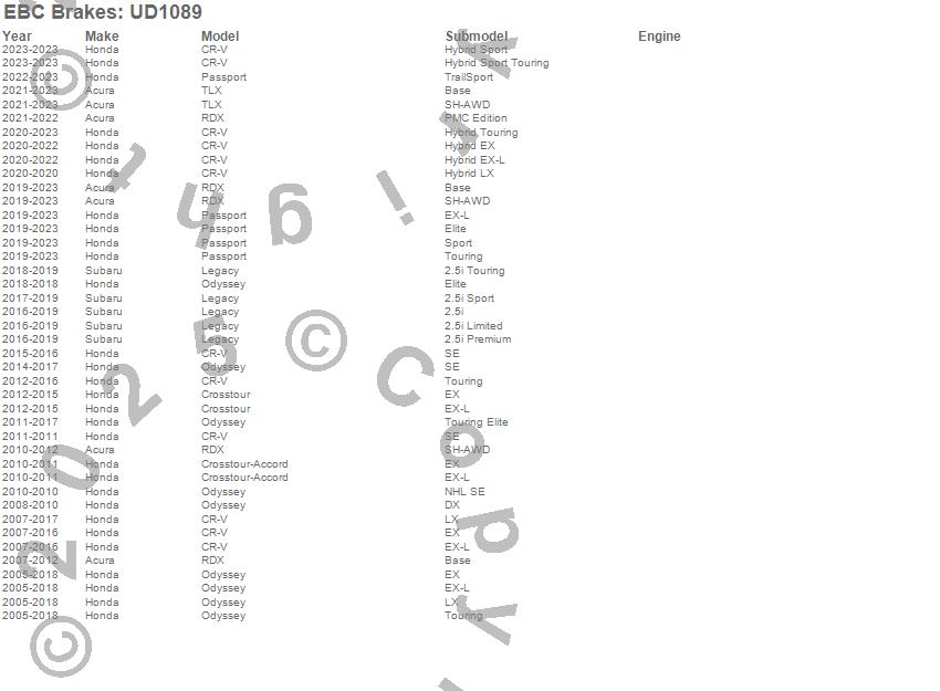 Below is an abreviated list of applications for the EBC Ultimax OEM Replacement Brake Pads. Accord Crosstour, CR-V, Crosstour, Odyssey, RDX, Acura, Honda, 2016, 2015, 2014, 2013, 2012, 2011, 2010, 2009, 2008, 2007, 2006, 2005 more…