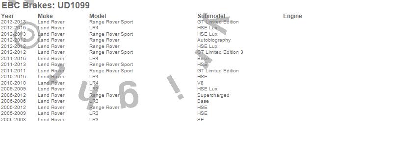 Below is an abreviated list of applications for the EBC Ultimax OEM Replacement Brake Pads. LR3, LR4, Range Rover, Range Rover Sport, Land Rover, 2016, 2015, 2014, 2013, 2012, 2011, 2010, 2009, 2008, 2007, 2006, 2005 more…