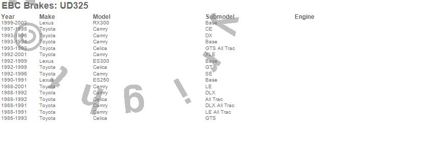 Below is an abreviated list of applications for the EBC Ultimax OEM Replacement Brake Pads. Camry, Celica, ES250, ES300, RX300, Lexus, Toyota, 2003, 2002, 2001, 2000, 1999, 1998, 1997, 1996, 1995, 1994, 1993, 1992, 1991 more…