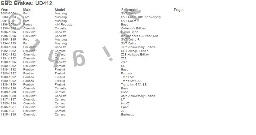 Below is an abreviated list of applications for the EBC Ultimax OEM Replacement Brake Pads. AIV Roadster, Camaro, Corvette, Firebird, Mustang, Chevrolet, Ford, Panoz, Pontiac, 2004, 2003, 2001, 2000, 1999, 1998, 1997, 1996, 1995, 1994, 1993 more…