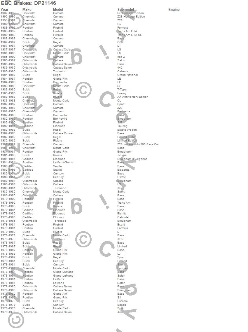 Bonneville, Camaro, Century, Cutlass, Cutlass Cruiser, Cutlass Salon, Eldorado, Firebird, Grand Am, Grand LeMans, Grand Prix, LeMans, Monte Carlo, Regal, Riviera, Seville, Toronado, Buick, Cadillac, Chevrolet more...
