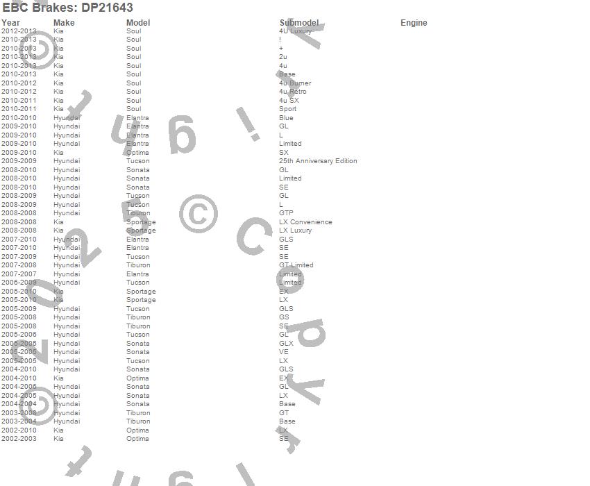 Below is an abreviated list of applications for the EBC Greenstuff 2000 Series Sport Brake Pads.