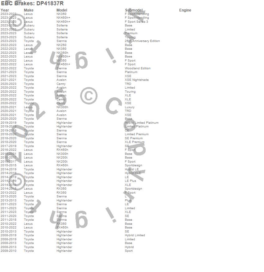 Below is an abreviated list of applications for the Yellowstuff Street And Track Brake Pads. Highlander, NX200t, NX300h, RX350, RX450h, Sienna, Lexus, Toyota, 2016, 2015, 2014, 2013, 2012, 2011, 2010, 2009, 2008 more…