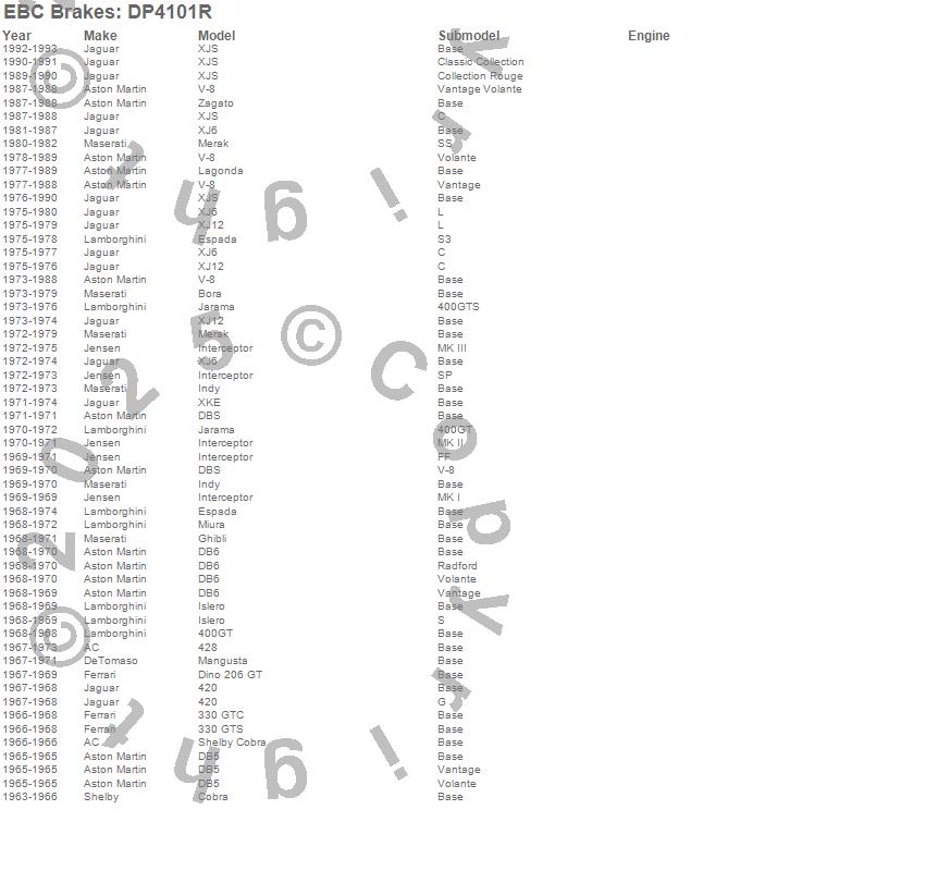 330 GTC, 330 GTS, 400GT, 420, 428, Bora, Cobra, DB5, DB6, DBS, Dino 206 GT, Espada, Ghibli, Indy, Interceptor, Islero, Jarama, Lagonda, Mangusta, Merak more…