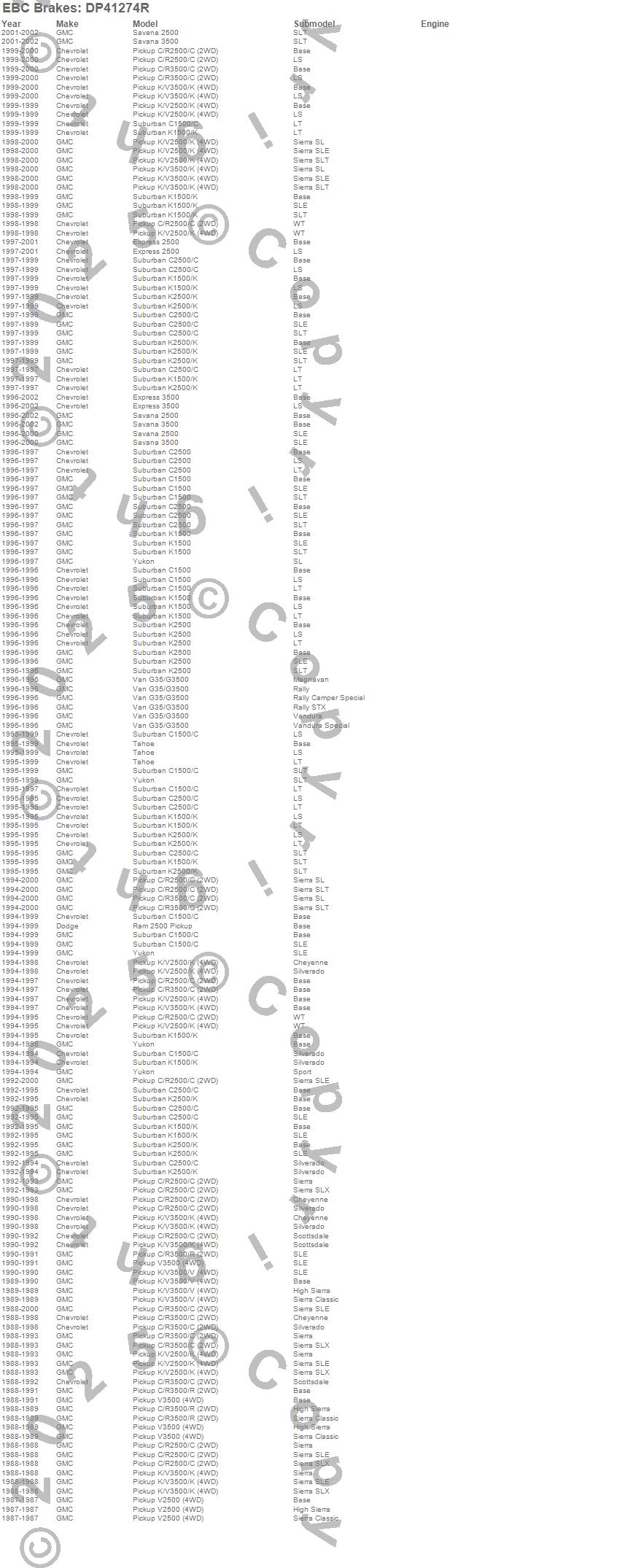 C1500 Suburban, C2500 Pickup, C2500 Suburban, C3500 Pickup, Express 2500, Express 3500, G35/G3500 Van, K1500 Suburban, K2500 Pickup, K2500 Suburban, K2500 Suburban (Canadian), K3500 Pickup, R3500 Pickup, Ram 2500, Savana 2500, Savana 3500, Tahoe, V2500 Pickup, V3500 Pickup, Yukon more…