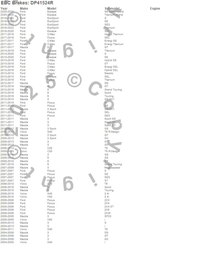 Below is an abreviated list of applications for the Yellowstuff Street And Track Brake Pads. 3, 3 Sport, 5, C-Max, C30, C70, Escape, Focus, S40, V50, Ford, Mazda, Volvo, 2016, 2015, 2014, 2013, 2012, 2011, 2010 more…
