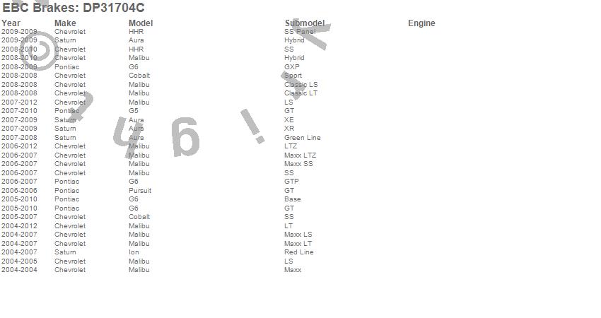 Below is an abreviated list of applications for the EBC Redstuff Ceramic Low Dust Brake Pads. Aura, Cobalt, G5, G6, HHR, Ion, Malibu, Pursuit, Chevrolet, Pontiac, Saturn, 2012, 2011, 2010, 2009, 2008, 2007, 2006, 2005, 2004 more…