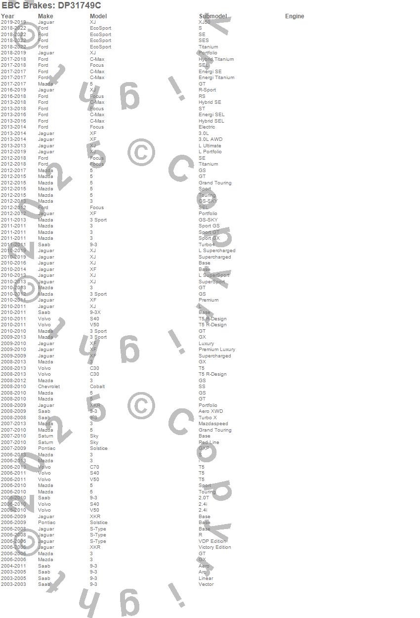 Below is an abreviated list of applications for the EBC Redstuff Ceramic Low Dust Brake Pads. 3, 3 Sport, 5, 9-3, 9-3X, C-Max, C30, C70, Cobalt, Focus, S-Type, S40, Sky, Solstice, V50, XF, XJ, XKR, Chevrolet, Ford more…