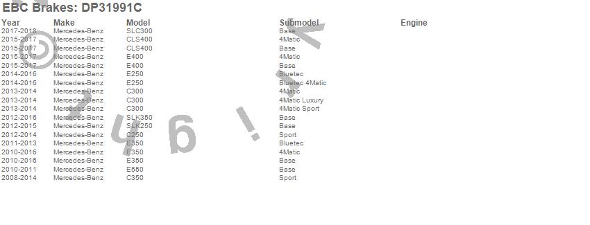 Below is an abreviated list of applications for the EBC Redstuff Ceramic Low Dust Brake Pads. C250, C300, C350, E250, E350, E400, E550, SLK250, SLK350, Mercedes-Benz, 2015, 2014, 2013, 2012, 2011, 2010, 2009, 2008 more...
