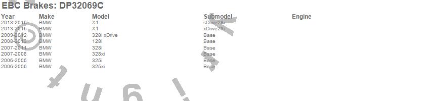 Below is an abreviated list of applications for the EBC Redstuff Ceramic Low Dust Brake Pads. 128i, 325i, 325xi, 328i, 328i xDrive, 328xi, X1, BMW, 2015, 2014, 2013, 2012, 2011, 2010, 2009, 2008, 2007, 2006 more…