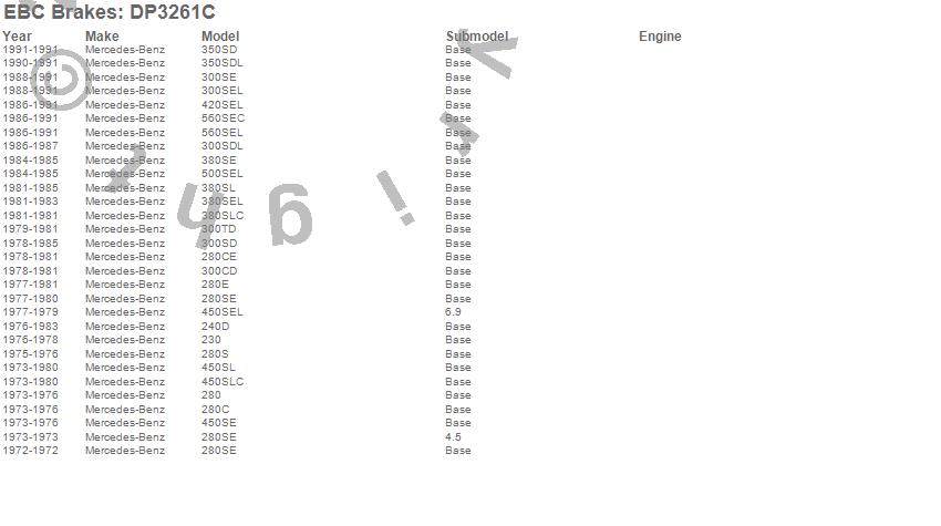 Below is an abreviated list of applications for the EBC Redstuff Ceramic Low Dust Brake Pads. 230, 240D, 280, 280C, 280CE, 280E, 280S, 280SE, 300CD, 300D, 300SD, 300SDL, 300SE, 300SEL, 300TD, 350SD, 350SDL, 380SE, 380SEL, 380SL more…
