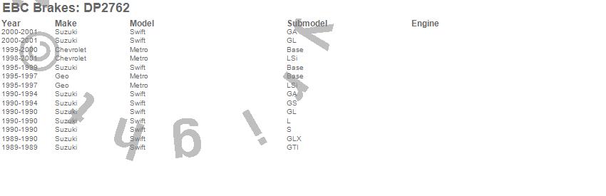 Below is an abreviated list of applications for the EBC Greenstuff 2000 Series Sport Brake Pads.