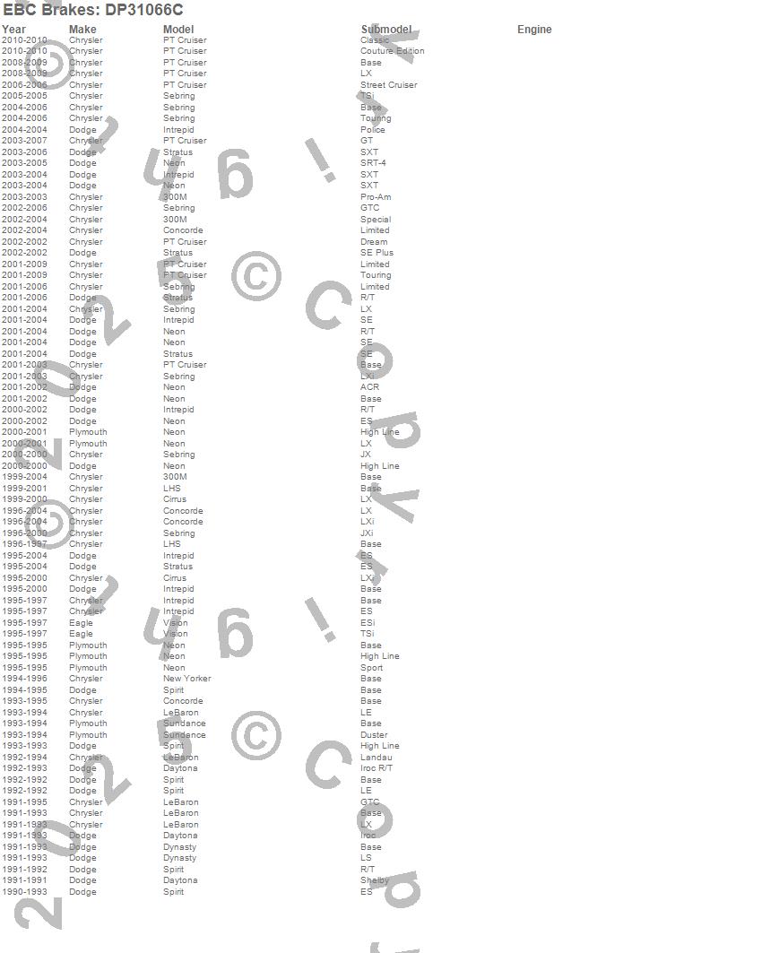 300M, Breeze, Cirrus, Concorde, Daytona, Dynasty, Intrepid, LeBaron, LHS, Neon, New Yorker, PT Cruiser, Sebring, Spirit, Stratus, Sundance, Vision, Chrysler, Dodge, Eagle more...