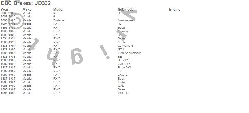 Below is an abreviated list of applications for the EBC Ultimax OEM Replacement Brake Pads. 6, Protege, RX-7, Mazda, 2005, 2004, 2003, 1995, 1994, 1993, 1991, 1990, 1989, 1988, 1987, 1986, 1985, 1984 more…