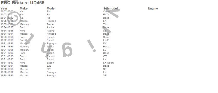 Below is an abreviated list of applications for the EBC Ultimax OEM Replacement Brake Pads. 323, Aspire, Escort, Protege, Rio, Tracer, Ford, Kia, Mazda, Mercury, 2002, 2001, 1998, 1997, 1996, 1995, 1994, 1993, 1992, 1991 more…
