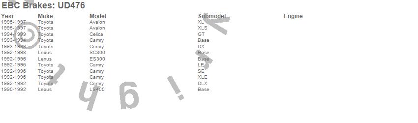 Below is an abreviated list of applications for the EBC Ultimax OEM Replacement Brake Pads. Avalon, Camry, Celica, ES300, LS400, SC300, Lexus, Toyota, 1999, 1998, 1997, 1996, 1995, 1994, 1993, 1992, 1991, 1990 more…