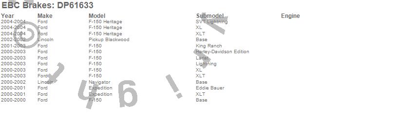 Below is an abreviated list of applications for the EBC 6000 Series Greenstuff Truck/SUV Brakes Disc Pads.